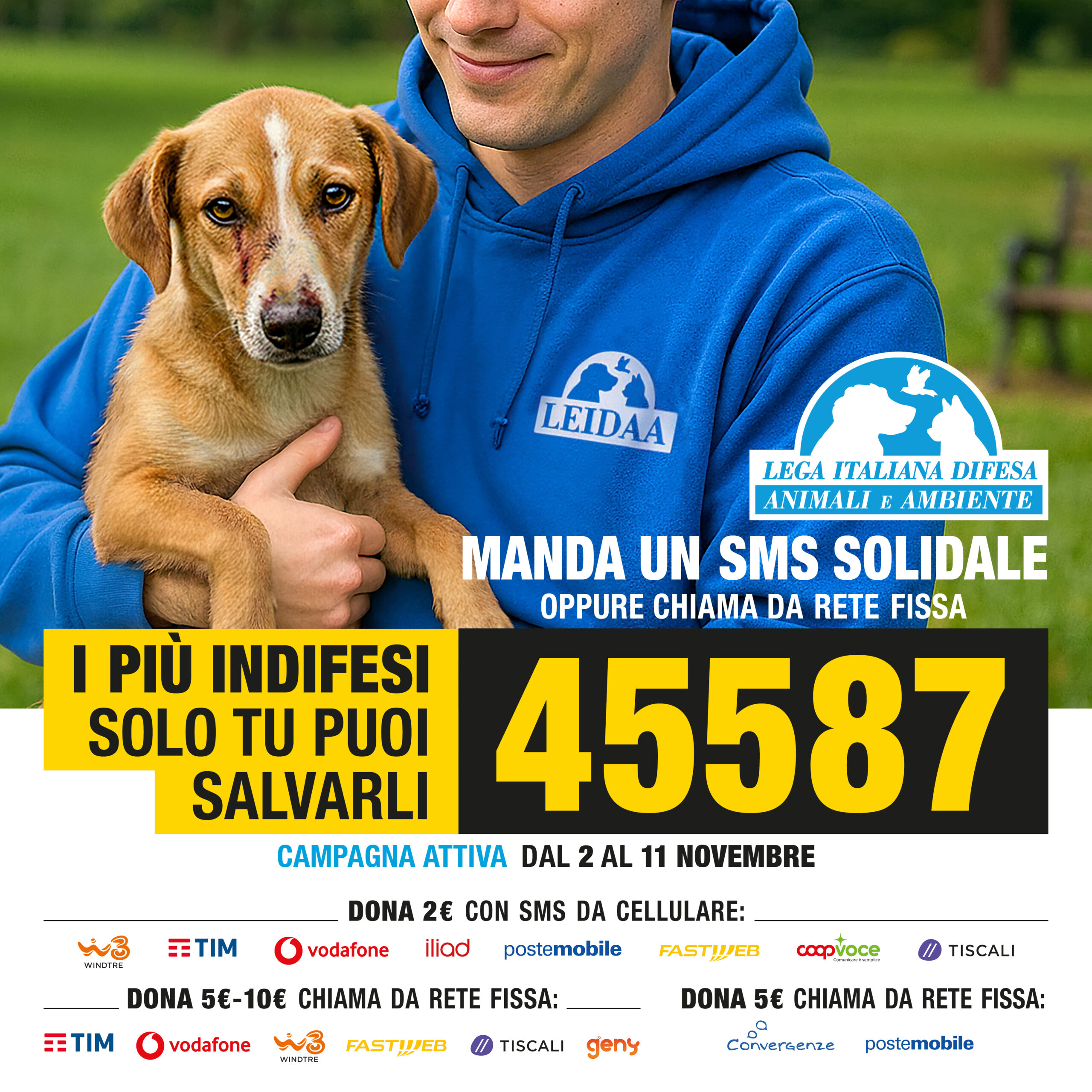 LEIDAA: DAL 2 ALL’11 NOVEMBRE INVIA UN SMS SOLIDALE AL NUMERO 45587 E SALVA GLI ANIMALI, SENZA VOCE E SENZA DIFESA