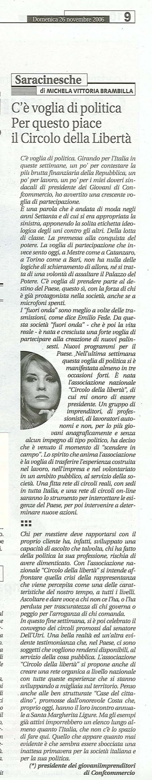 23/11/2006 – Libero"Saracinesche" di Michela Vittoria Brambilla.C'è voglia di politica. Per questo piace il Circolo della Libertà
