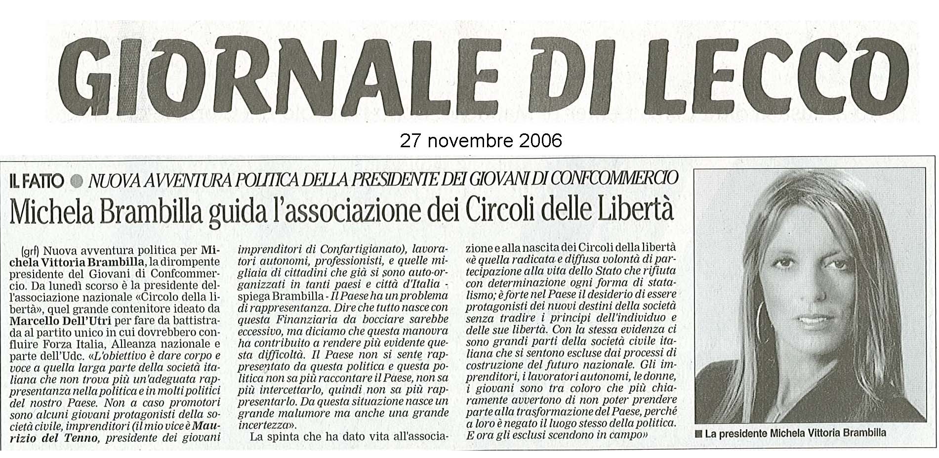 27/11/2006 – Giornale di LeccoMichela Brambilla guida l'associazione dei Circoli della Libertà