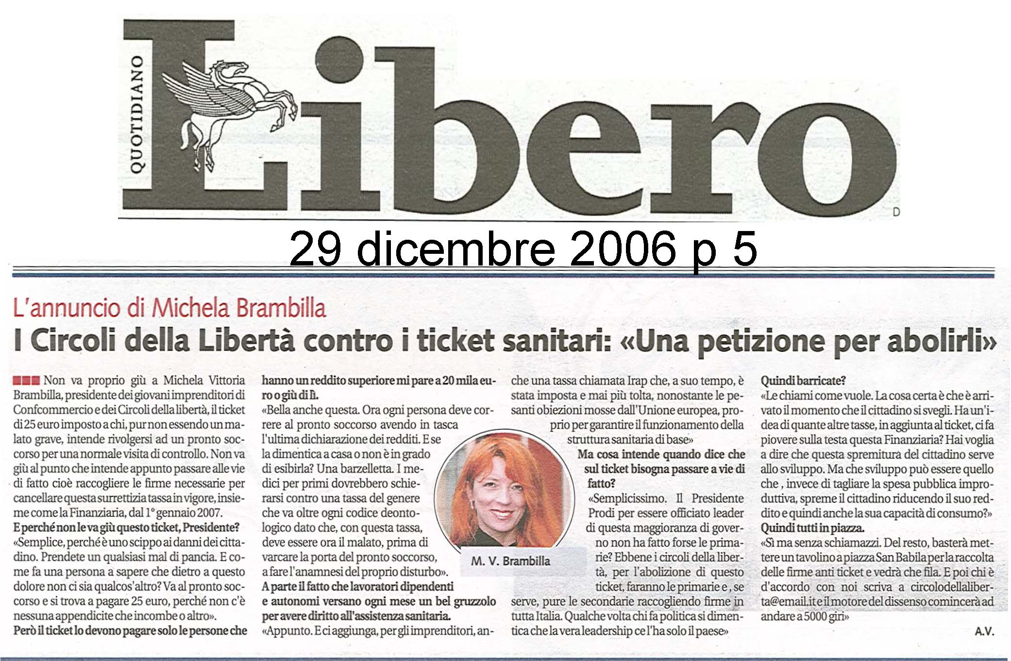 29/12/2006 – LiberoI Circoli della Libertà contro i ticket sanitari: "Una petizione per abolirli"