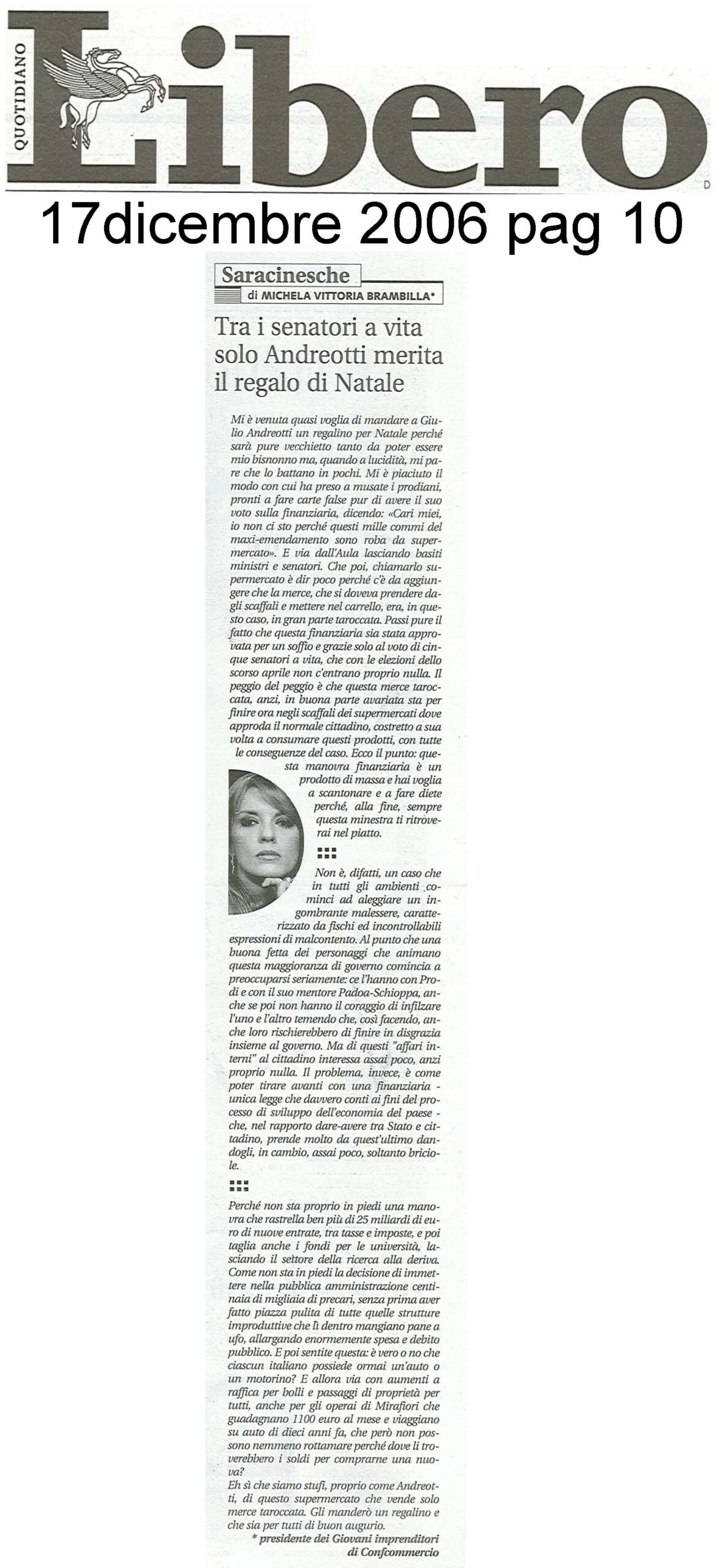 17/12/2006 – Libero"Saracinesche" di Michela Vittoria Brambilla.Tra i senatori a vita solo Andreotti merita il regalo di Natale