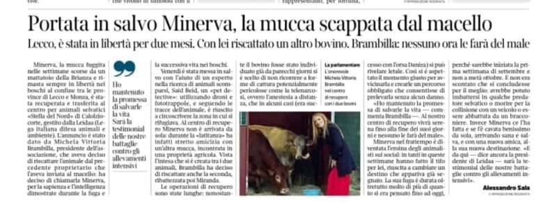 IL CORRIERE DELLA SERA. PORTATA IN SALVO MINERVA, LA MUCCA SCAPPATA DAL MACELLO
