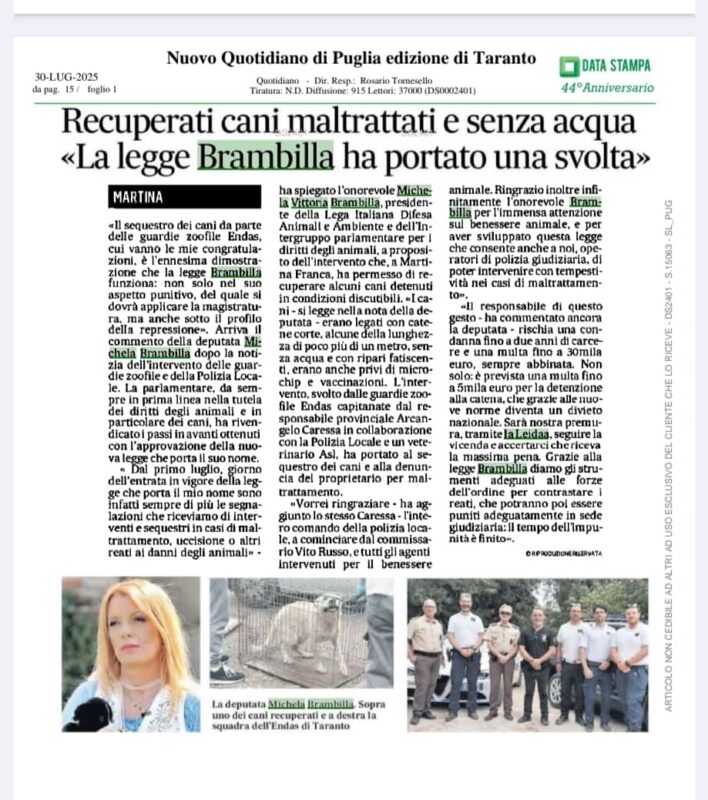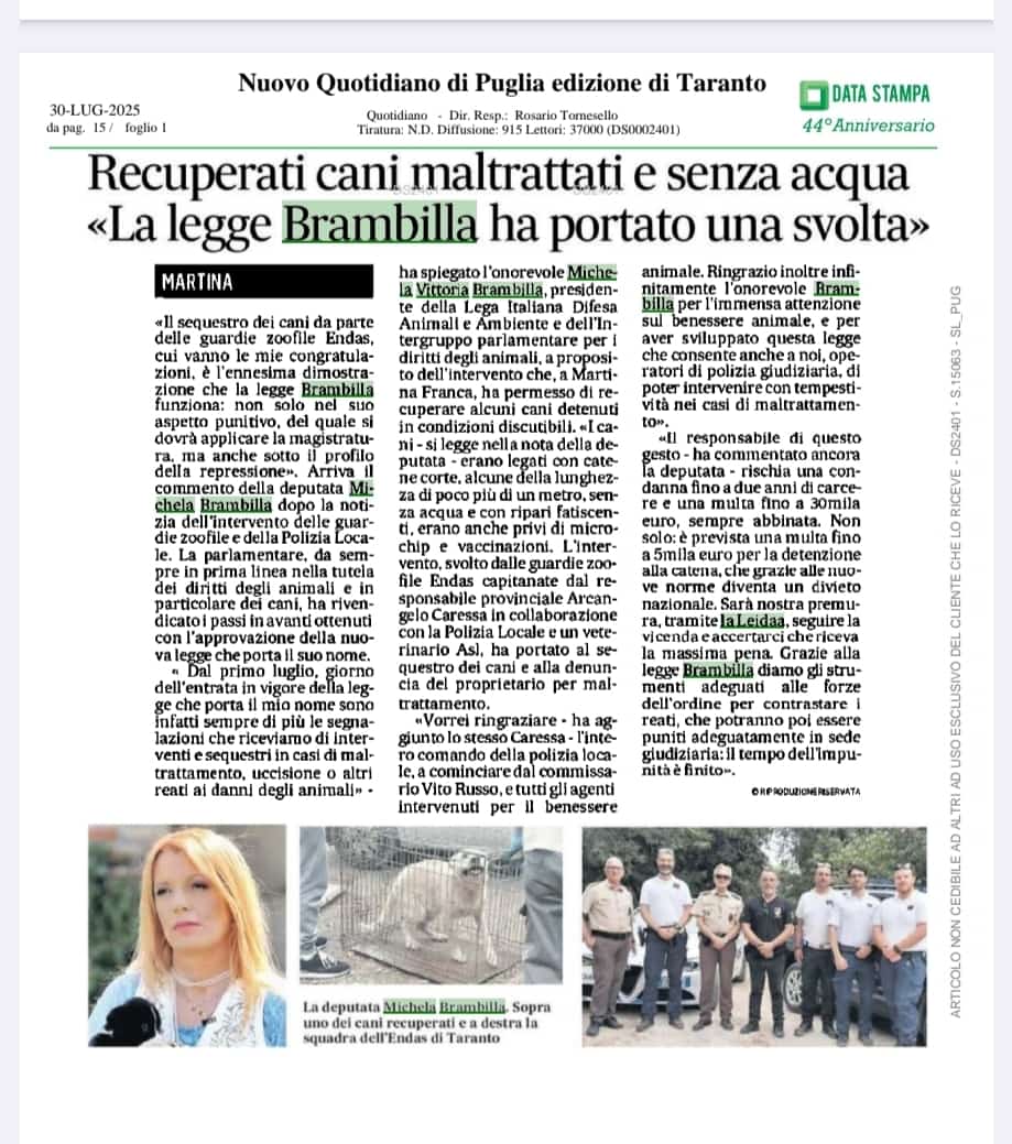 NUOVO QUOTIDIANO DI PUGLIA. RECUPERATI CANI MALTRATTATI E SENZ’ACQUA: “LA LEGGE BRAMBILLA HA PORTATO A UNA SVOLTA”